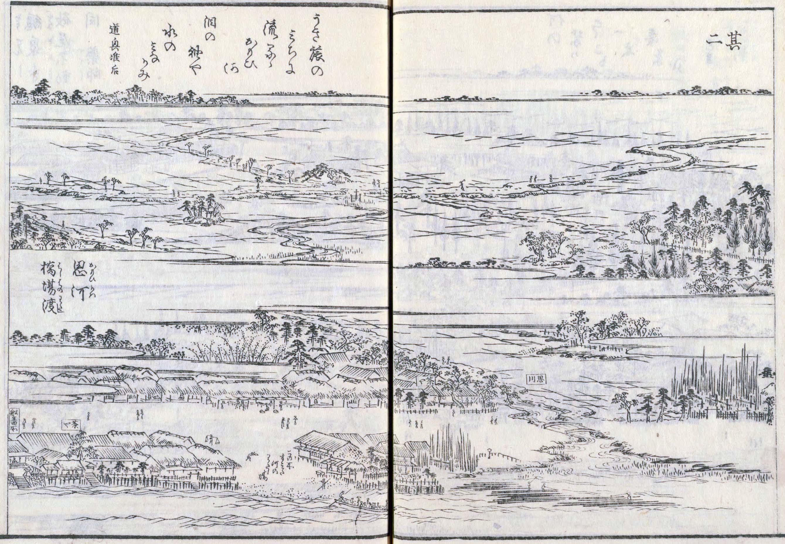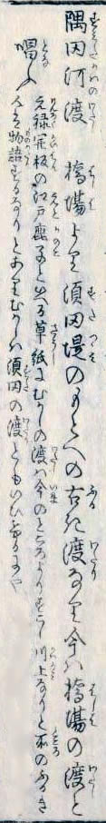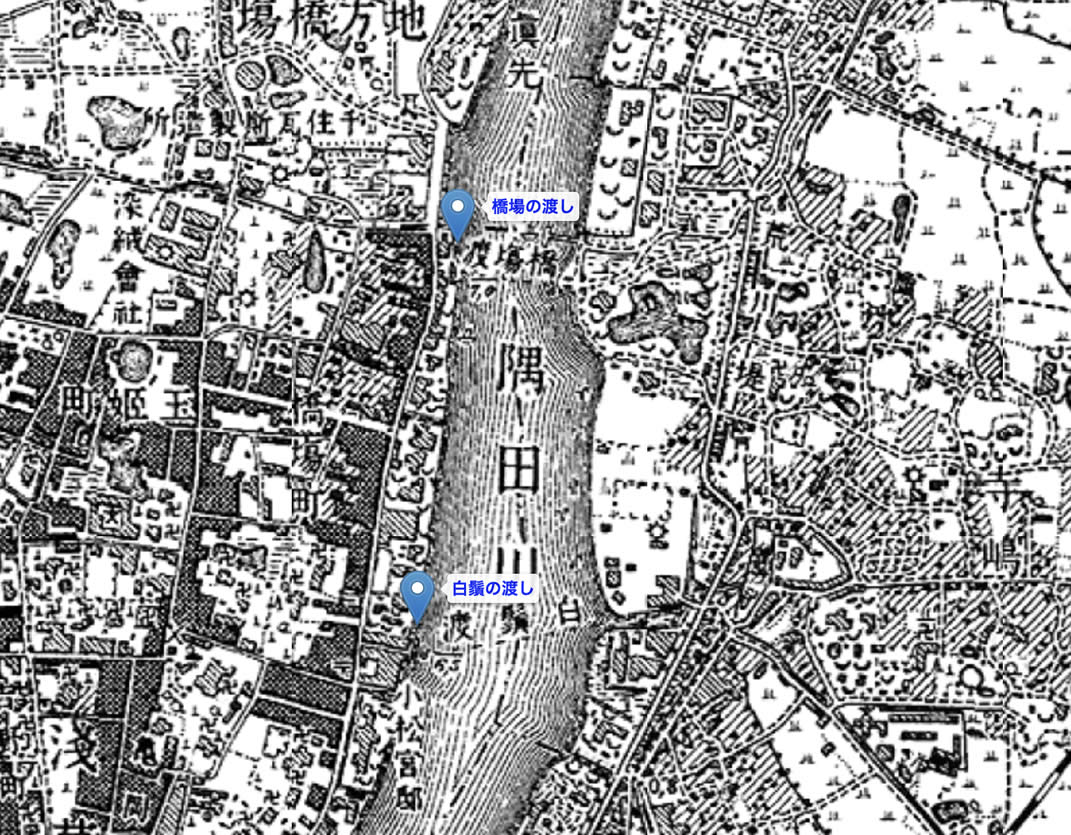地図で見る隅田川の渡し= 橋場の渡し = 地図で見る隅田川の渡し地図目次 《橋場の渡し》 現在の白鬚橋付近にあった。歴史的に位置や名称に変遷があったが、記録に残る隅田川の渡しとしては最も古い。律令時代の承和2年(835年)の太政官符に「住田の渡し」と書かれたものが残っている。 奥州、総州への古道があり、伊勢物語で主人公が渡ったのもこの渡しとされている。また、源頼朝が挙兵してこの地に入る際に、歴史上隅田川に最初に架橋した「船橋」もこの場所とされ、「橋場」という名が残ったとも伝えられている。 橋場は歴史の古い土地柄から江戸時代から風流な場所とされ、大名や豪商の別荘が隅田川河岸に並び、有名な料亭も多かった。明治期に入ってからも屋敷が建ち並んでおり、とりわけ著名な三条実美の別荘である「對鴎荘」が橋場の渡しの西岸にあった。 歌川広重が錦絵「墨田河橋場の渡かわら竈」に描いた。白鬚橋の完成に伴い、大正期に廃止されたといわれる。 Wikipedia 下の「江戸名所図会」(天保5-7 [1834-1836])の、「角田河渡(すみたかはのわたし)」の説明部分には、『隅田河渡(すみだがわのわたし) 橋場(はしば)より須田堤(すだづつみ)のもとへの古(ふる)き渡(わたし)なり。今は橋場(はしば)の渡(わたし)と唱(とな)う。元禄(げんろく)開板(かいばん)の江戸鹿子(えどかのこ)といえる草紙(そうし)に、むかしの渡(わたし)は今(いま)のところよりすこし川上(かわかみ)なりと所(ところ)のふるき人は物語(ものがたり)するなりとあり。むかしは須田(すだ)の渡(わたし)ともいいけるにや』とある。 「江戸名所図会」 斎藤長秋著/長谷川雪旦画「隅田河渡」 (国立国会図書館蔵) 西村重長「絵本江戸みやげ」 「橋場の舟渡し」 (国立国会図書館蔵) 長谷川雪旦「江戸名所図会」 「橋場の渡し」 左下に「この所すみだ河のわたし場」の文字が見える。 (国立国会図書館蔵) 長谷川雪旦「江戸名所図会」 「角田河渡(橋場の渡し)」 (国立国会図書館蔵) 長谷川雪旦「江戸名所図会」 「隅田川渡(橋場への渡口)」 左下に「橋場への渡口」の文字が見える。 (国立国会図書館蔵) 歌川広重「絵本江戸土産」 「橋場の渡し」 (国立国会図書館蔵) 歌川広重『名所江戸百景』墨田河橋場の渡かわら竈 [注]Wikipedia では、『白鬚の渡しとも呼ばれた』と表記される(上記引用では削除)Wikipedia が(2021年10月29日現在)、明治42年の地図では「橋場の渡し」と「白鬚の渡し」が別の場所に表示され、大正6年から昭和20年までの地図では「橋場の渡し」の場所が白鬚橋となり、その下流に「白鬚の渡し」が残る。そのため、ここでは「橋場の渡し」と「白鬚の渡し」を分けて掲載した 。 明治42年測図による「橋場の渡し」と「白鬚の渡し」の位置関係 (「今昔マップ 」より作成) 《橋場の渡し》 *初期設定の左の地図は「関東平野迅速測図」と呼ばれる地図で、明治前期の、明治13年〈1880年〉から明治19年〈1886年〉にかけての関東平野。 *初期設定での地図の中心点が渡船場付近。 地図を拡大 地図で見る隅田川の渡し目次