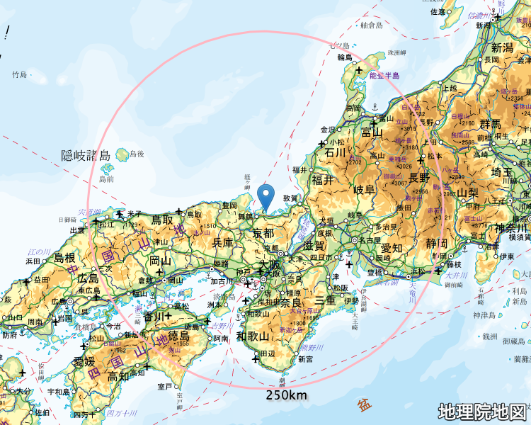・この地図の円は、半径250kmを表しています。