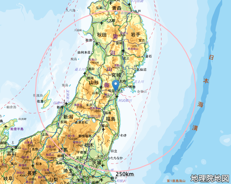 原発列島/地図で見る日本の全原発[距離可変] 日本の原発個別地図[距離可変] 原発 30km地図 - 『神隠しされた街』[付:県庁から30km] 原発 250km地図[付:県庁から250km] 〈参考〉 宮城県庁から半径250km圏内地図= 全国原子力施設の半径250km圏内地図を見る = ・この地図の円は、半径250kmを表しています。 ・宮城県庁(みやぎけんちょう) ・仙台市青葉区本町3丁目8番1号