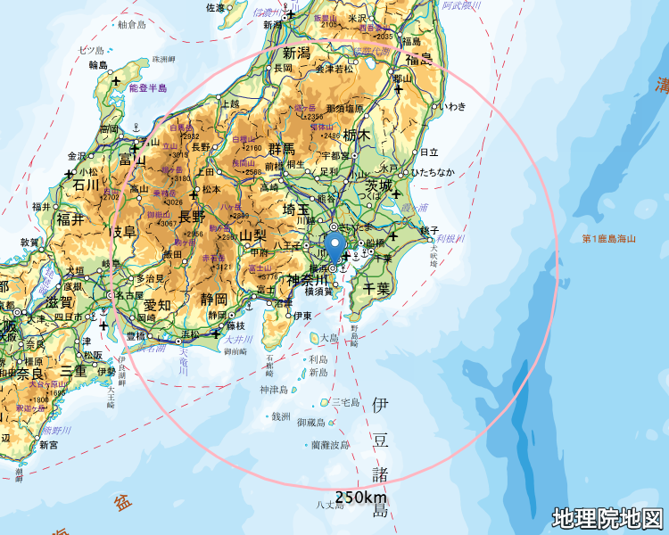 原発列島/地図で見る日本の全原発[距離可変] 日本の原発個別地図[距離可変] 原発 30km地図 - 『神隠しされた街』[付:県庁から30km] 原発 250km地図[付:県庁から250km] 〈参考〉 神奈川県庁から半径250km圏内地図= 全国原子力施設の半径250km圏内地図を見る = ・この地図の円は、半径250kmを表しています。 ・神奈川県庁(かながわけんちょう) ・横浜市中区日本大通1