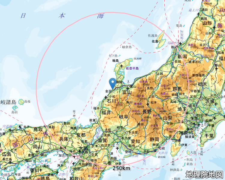 原発列島/地図で見る日本の全原発[距離可変] 日本の原発個別地図[距離可変] 原発 30km地図 - 『神隠しされた街』[付:県庁から30km] 原発 250km地図[付:県庁から250km] 〈参考〉 石川県庁から半径250km圏内地図= 全国原子力施設の半径250km圏内地図を見る = ・この地図の円は、半径250kmを表しています。 ・石川県庁(いしかわけんちょう) ・金沢市鞍月一丁目1番地