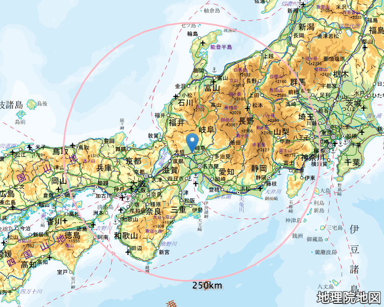 原発列島/地図で見る日本の全原発[距離可変] 日本の原発個別地図[距離可変] 原発 30km地図 - 『神隠しされた街』[付:県庁から30km] 原発 250km地図[付:県庁から250km] 〈参考〉 岐阜県庁から半径250km圏内地図= 全国原子力施設の半径250km圏内地図を見る = ・この地図の円は、半径250kmを表しています。 ・岐阜県庁(ぎふけんちょう) ・岐阜市薮田南2丁目1番1号