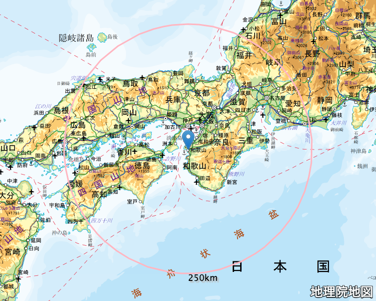 原発列島/地図で見る日本の全原発[距離可変] 日本の原発個別地図[距離可変] 原発 30km地図 - 『神隠しされた街』[付:県庁から30km] 原発 250km地図[付:県庁から250km] 〈参考〉 和歌山県庁から半径250km圏内地図= 全国原子力施設の半径250km圏内地図を見る = ・この地図の円は、半径250kmを表しています。 ・和歌山県庁(わかやまけんちょう) ・和歌山市小松原通一丁目1番地