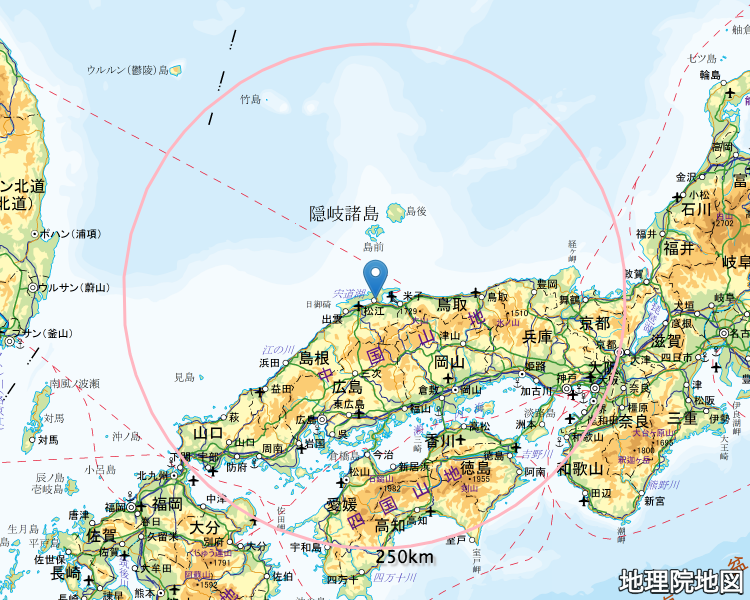 原発列島/地図で見る日本の全原発[距離可変] 日本の原発個別地図[距離可変] 原発 30km地図 - 『神隠しされた街』[付:県庁から30km] 原発 250km地図[付:県庁から250km] 〈参考〉 島根県庁から半径250km圏内地図= 全国原子力施設の半径250km圏内地図を見る = ・この地図の円は、半径250kmを表しています。 ・島根県庁(しまねけんちょう) ・松江市殿町1番