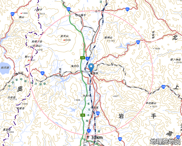 原発列島/地図で見る日本の全原発[距離可変] 日本の原発個別地図[距離可変] 原発 30km地図 - 『神隠しされた街』[付:県庁から30km] 原発 250km地図[付:県庁から250km] ■ 半径30km圏内地図・都道府県目次 北海道 青森県 岩手県 宮城県 秋田県 山形県 福島県 茨城県 栃木県 群馬県 埼玉県 千葉県 東京都 神奈川県 新潟県 富山県 石川県 福井県 山梨県 長野県 岐阜県 静岡県 愛知県 三重県 滋賀県 京都府 大阪府 兵庫県 奈良県 和歌山県 鳥取県 島根県 岡山県 広島県 山口県 徳島県 香川県 愛媛県 高知県 福岡県 佐賀県 長崎県 熊本県 大分県 宮崎県 鹿児島県 沖縄県 岩手県庁から半径30km圏内地図 ・この地図の円は、半径30kmを表しています。 ・岩手県庁(いわてけんちょう) ・盛岡市内丸10番1号