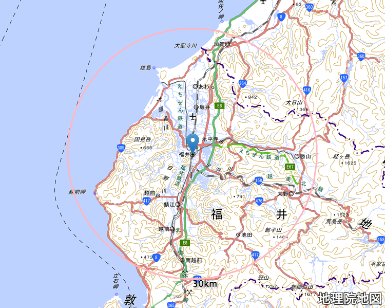 原発列島/地図で見る日本の全原発[距離可変] 日本の原発個別地図[距離可変] 原発 30km地図 - 『神隠しされた街』[付:県庁から30km] 原発 250km地図[付:県庁から250km] ■ 半径30km圏内地図・都道府県目次 北海道 青森県 岩手県 宮城県 秋田県 山形県 福島県 茨城県 栃木県 群馬県 埼玉県 千葉県 東京都 神奈川県 新潟県 富山県 石川県 福井県 山梨県 長野県 岐阜県 静岡県 愛知県 三重県 滋賀県 京都府 大阪府 兵庫県 奈良県 和歌山県 鳥取県 島根県 岡山県 広島県 山口県 徳島県 香川県 愛媛県 高知県 福岡県 佐賀県 長崎県 熊本県 大分県 宮崎県 鹿児島県 沖縄県 福井県庁から半径30km圏内地図 ・この地図の円は、半径30kmを表しています。 ・福井県庁(ふくいけんちょう) ・福井市大手三丁目17番1号